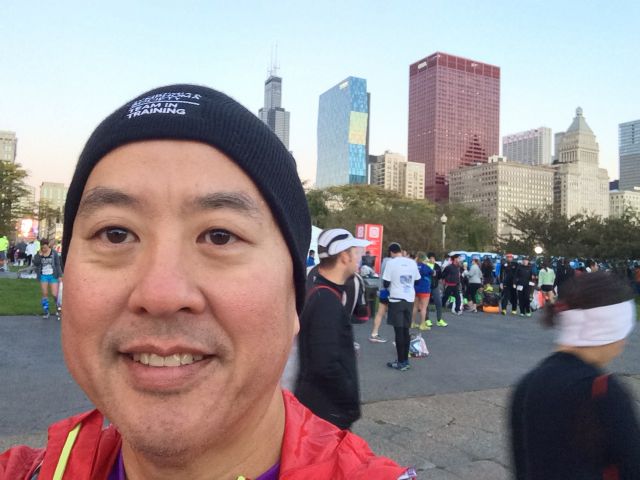 We gathered in the hotel lobby between 5:30 and 6:00am with the intention of walking over as a team and flooding the streets of Chicago with purple TNT race jerseys. This was one of those ideas that sounds a lot better than it works because most people realized that that was WAY too early to start lining up for an 8:00am start and those of use who did walk over together were bundled up in jackets and trash bag ponchos lovingly made by Coach Tim.