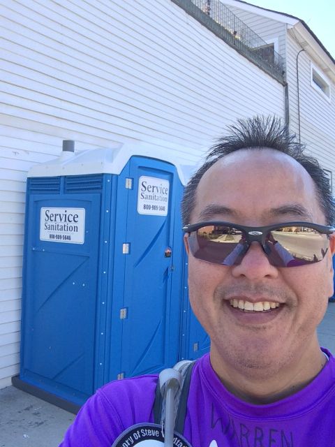Unfortunately, I was very focused on having a good race, so I didn’t stop to take any pictures along the way. The lone exception was a selfie by the porta-potties, which is kind of a (no pun intended) running joke with my friend Paulie. She always takes selfies during her runs and, invariably, there will be at least one porta-potty in the background somewhere. So, here’s my tribute to Paulie, taken at the Mile 19 aid station. (Oversharing Alert: the only reason I stopped was because I actually had to use one of those.)