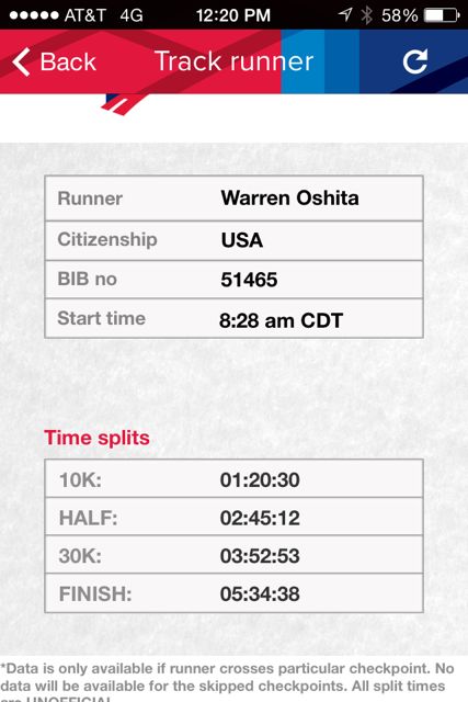 Paulie actually knew my time before I did and sent me this pic. 5 hours, 34 minutes, 38 seconds!  If my math is right, that’s 26 minutes and 6 seconds faster than my 6 hours, 44 second time at the 2013 Nike Women’s Marathon. So, even though I didn’t break 5:30, I was still very happy with that time. Got some nice hardware, too.