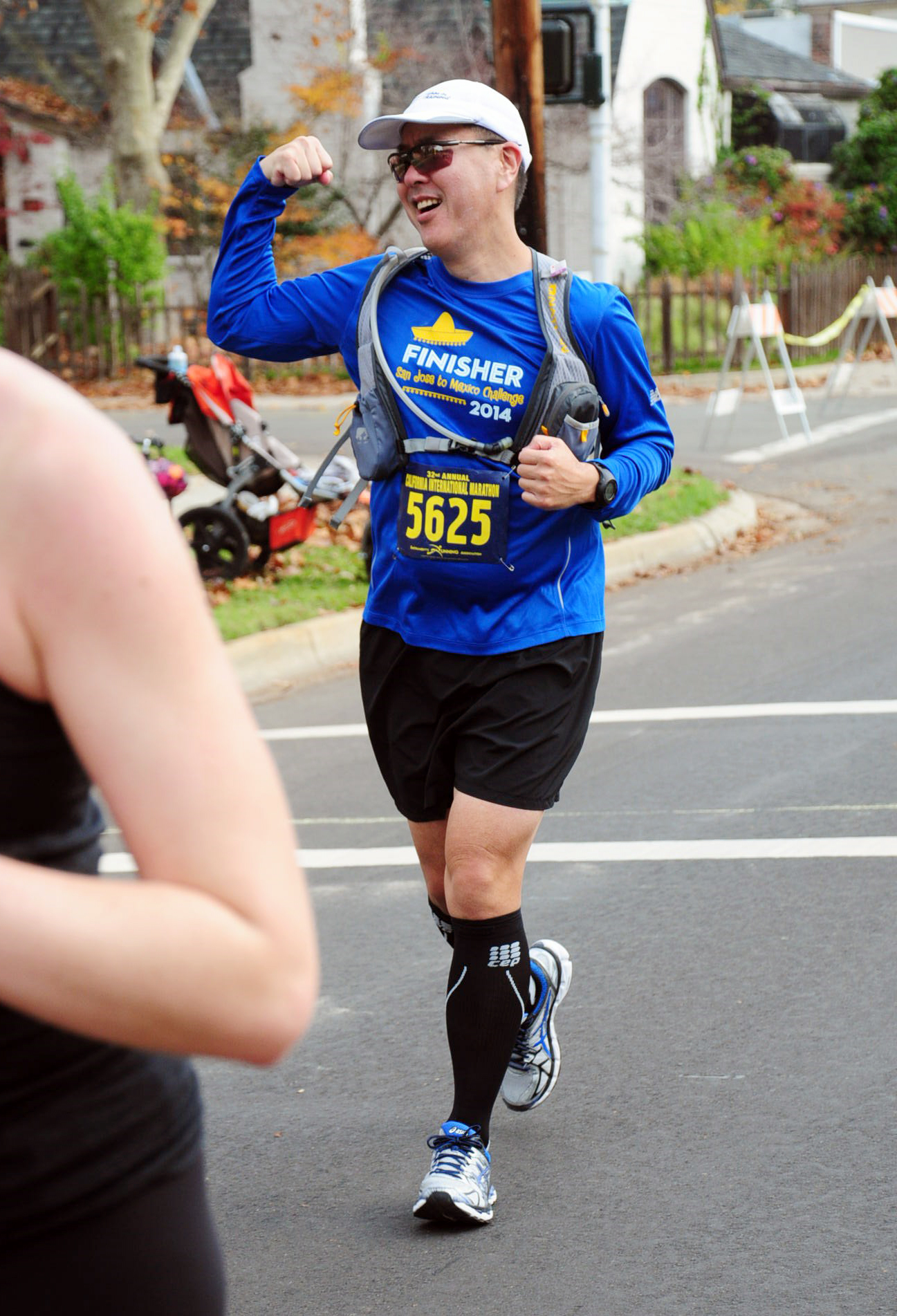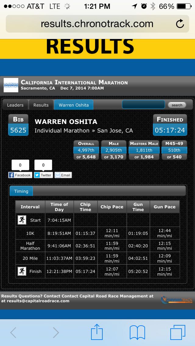 The race itself was close to perfect: flat, cool and not too windy. I was going to try for a negative split (running the second half of the race faster than the first) AND get a PR (personal record). So, my strategy was to alternate running a 12:00min/mile pace for five minutes and walking a 17:00min/mile pace for one minute. The trouble was the tall buildings blocked the GPS satellite signals and I couldn’t tell how fast I was running. After the first few miles, I knew I was going too fast and tried to slow down, but by then it was too late. So I created new plan: just keep that regular pace going as long as I could, then adjust the ratio of run:walk until I found a ratio that worked until I crossed the finish line. It kind of worked. I ended up running the second half only 10 5 minutes slower than the first half, which is exactly what I did during my first marathon. (Edited for math, at which I suck.)