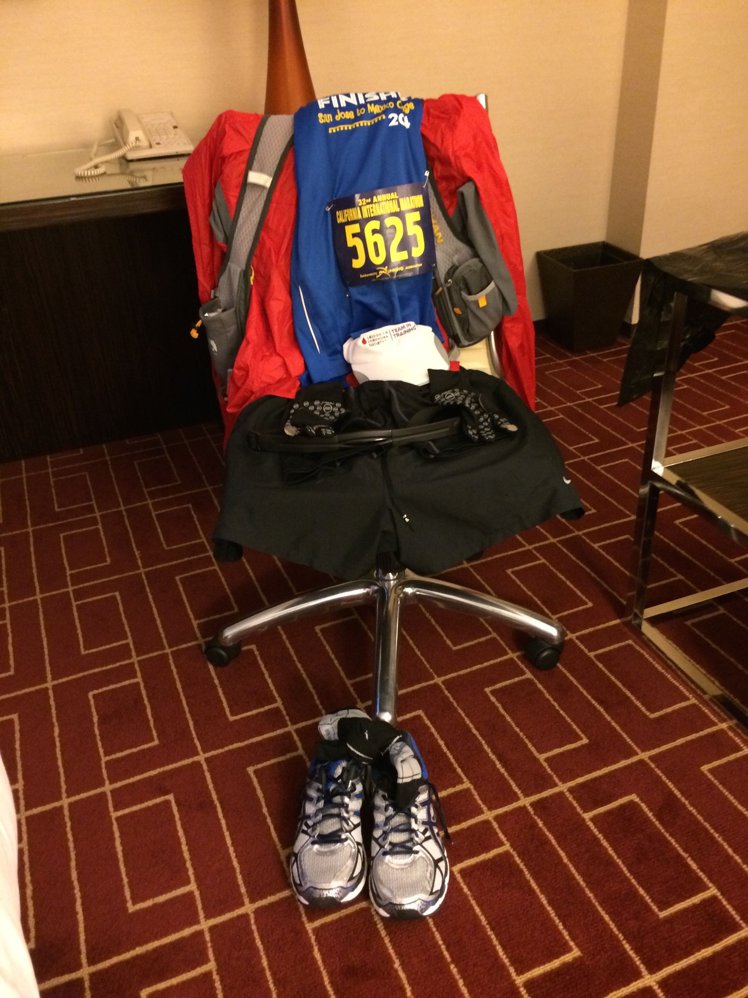 One good thing about CIM is it’s close to home. I left at 12:30pm and arrived at 3:30pm, with a pit stop in Walnut Creek to get some last-minute supplies and lunch. Walnut Creek traffic was kind of annoying, but I got to the marathon expo to pick up my race bib and everything went smoothly. Along they way, I bumped into Leslie and Christy A., whom I hadn’t seen in a while. Leslie wasn’t up to running the full marathon and Christy’s running partner had to withdraw at the last minute, so we made tentative plans to look for each other on the course. That would come in handy later.