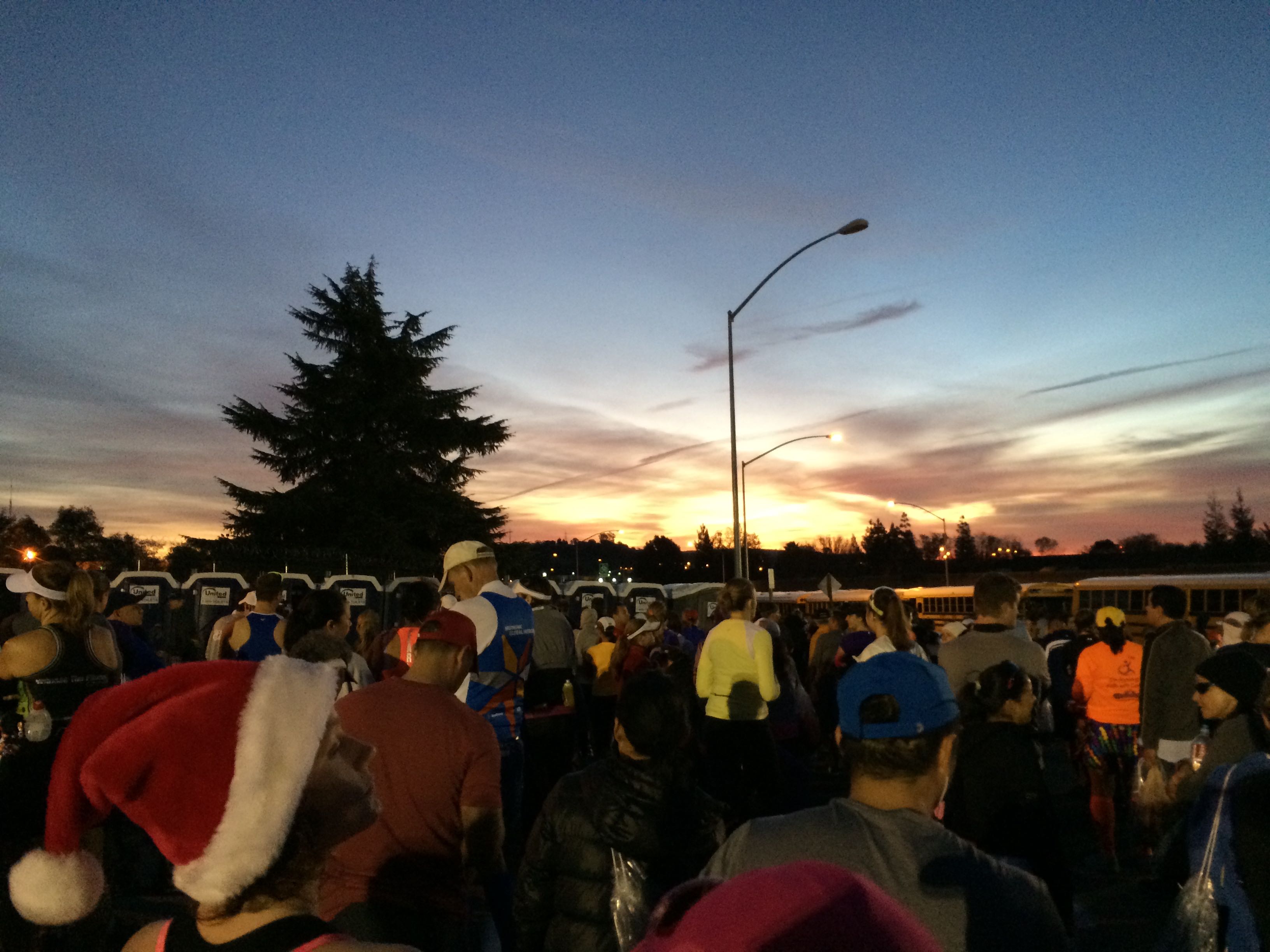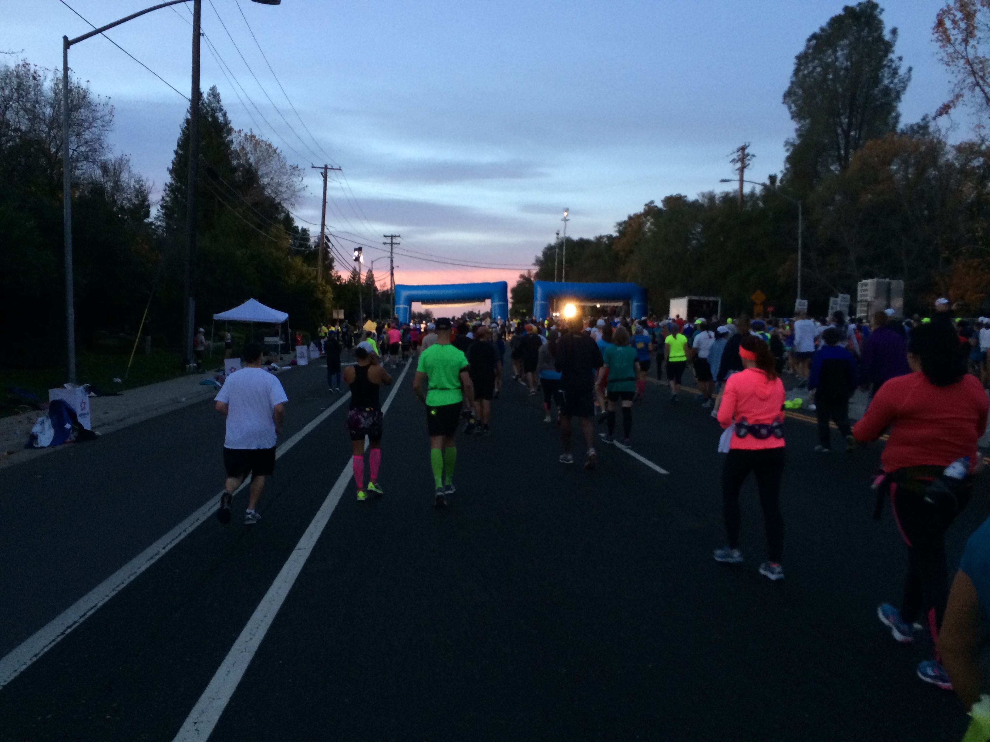 The California International Marathon (CIM), which starts in Folsom and ends in our state’s capitol, is known for being fast and unpredictable. Fast, because it’s a net-downhill. There are rolling hills, but there’s about 400′ of climbing and 800′ of descending. That leads to a very high percentage of runners who “Boston Qualify,” which means they run such a fast time that they qualify to run perhaps the most prestigious marathon in the US, if not the world. Its nickname is “the fastest course in the West.” And unpredictable, because it’s in December in California’s Central Valley, so the weather can be cold, wet, or even a little on the warm side (relatively speaking, 70 degrees is warm for December).