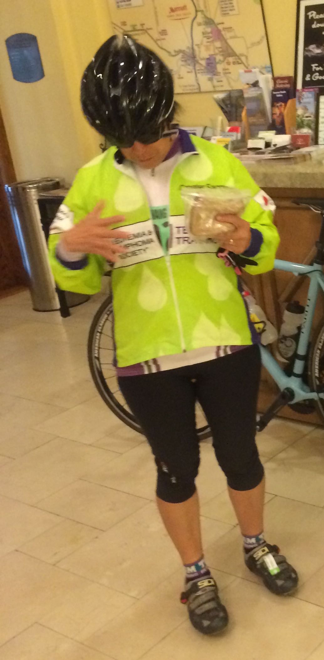 At one of the rest stops after the halfway point, I saw Team in Training Sacramento signs. I thought, “Hmm, Barbara from the Solvang ’14 team lives out here. I wonder if she’s here?” Sure enough, I saw her the next instant! She drove out from Elk Grove every other weekend to train with us because her local team wasn’t doing Solvang. Here’s the best photo I have of her (and it’s not very good).