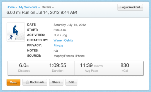 Anyway, since MapMyFitness doesn’t export workout data, I did some screen shots of my longest run to-date.
